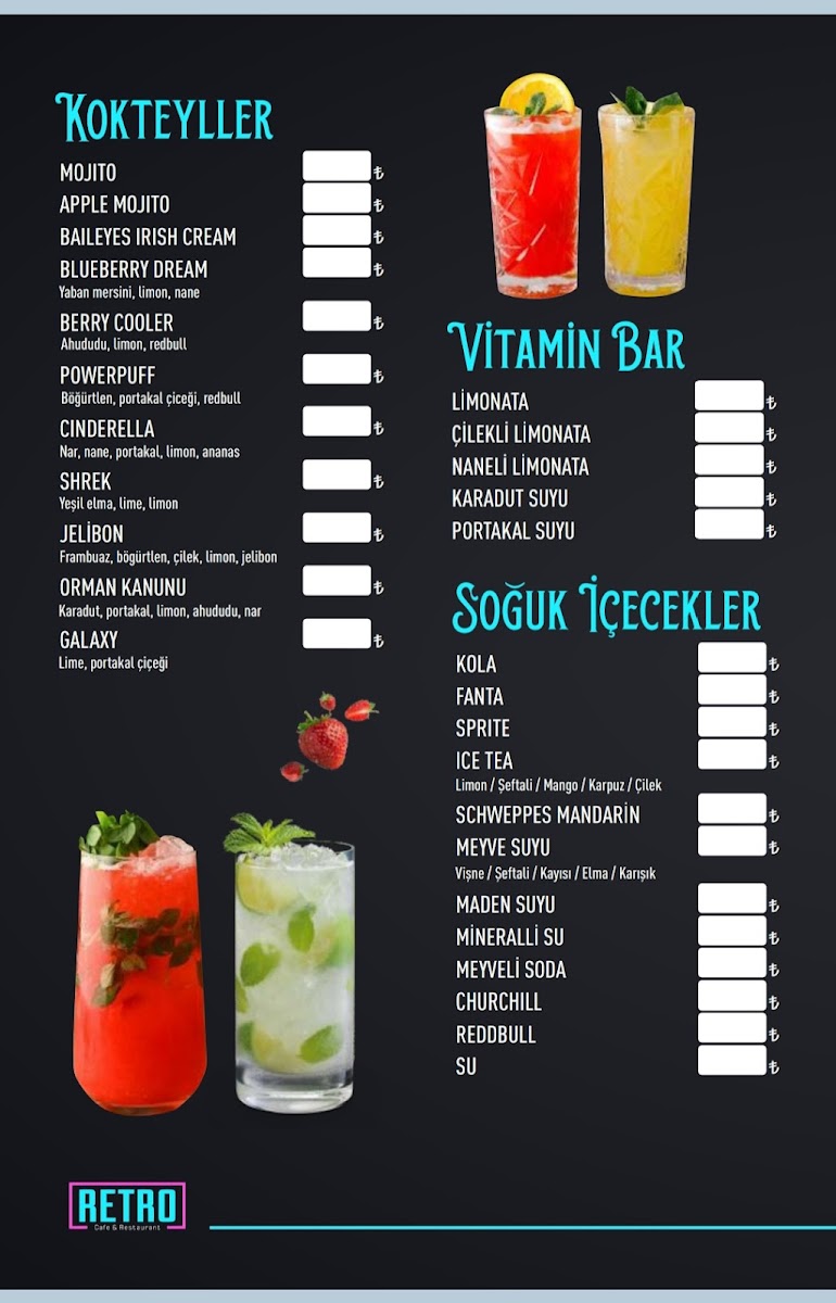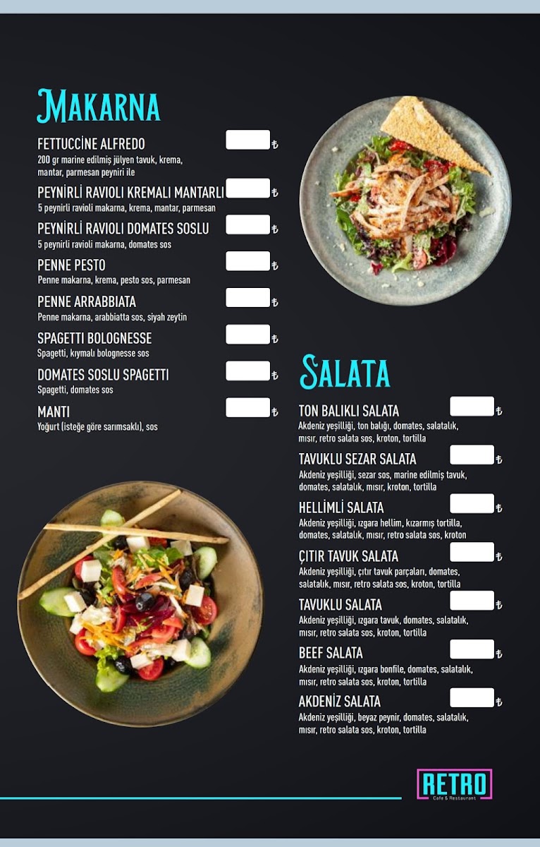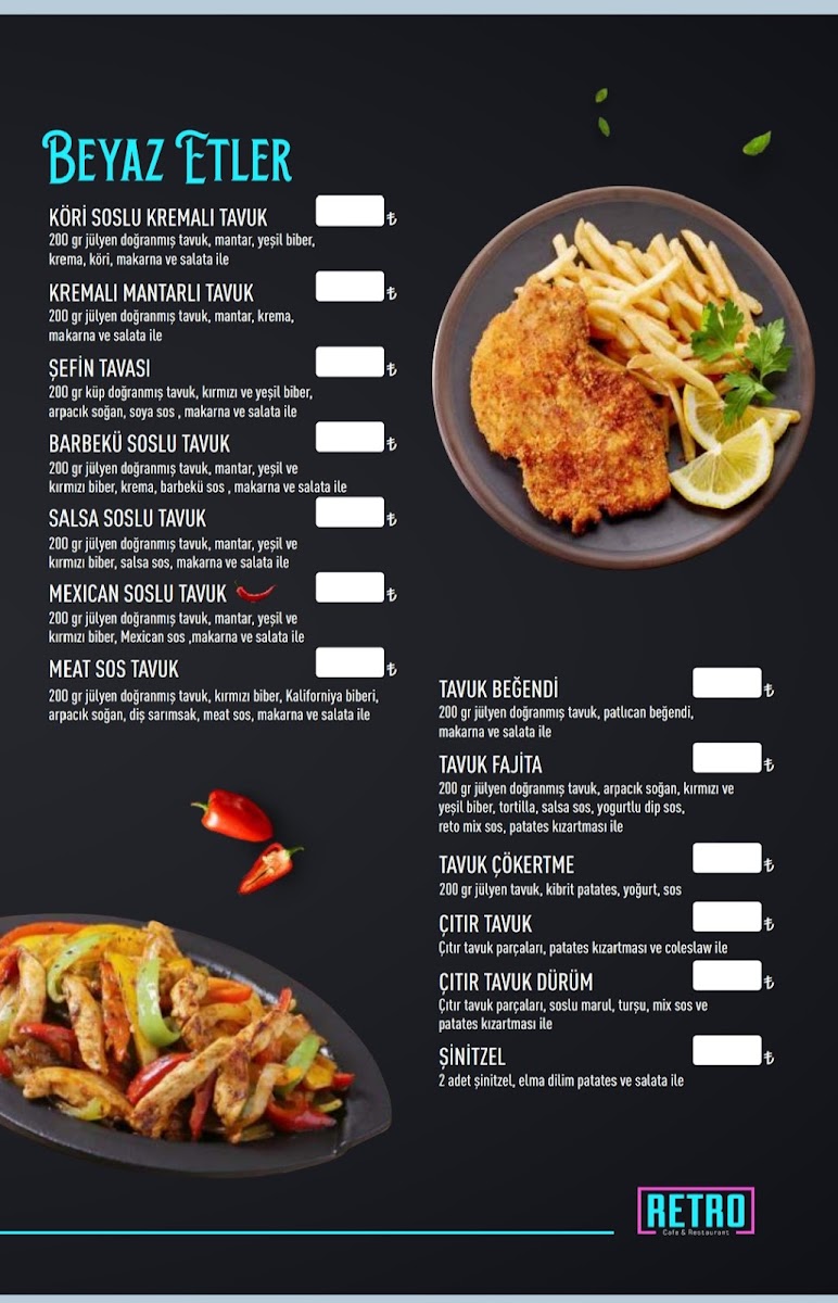 Welcome to Retro Cafe & Restaurant, an enchanting eatery nestled in Akyazı, Türkiye, where nostalgia meets culinary delight. The menu is a treasure trove of flavors, showcasing mouthwatering options from gourmet pizzas to succulent white meats. Indulge in their famous Margarita Pizza or take a savory trip with the Akdeniz Pizza, each dish crafted to perfection. The white meat section features delightful creations like Köri Soslu Kremalı Tavuk and crispy Çıtır Tavuk, ensuring satisfaction for every palate.